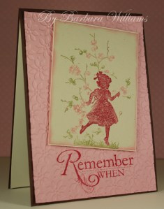 I used the Confetti Cream Card Stock to stamp the girl I used both the Rose Red Marker on the girl and the Old Olive marker on the grass area, after stamping down my little girl, I again stamped her on a post it note so that I could cut her out and use her as a mask to then stamp my blossoms, after using the markers on the stamp.