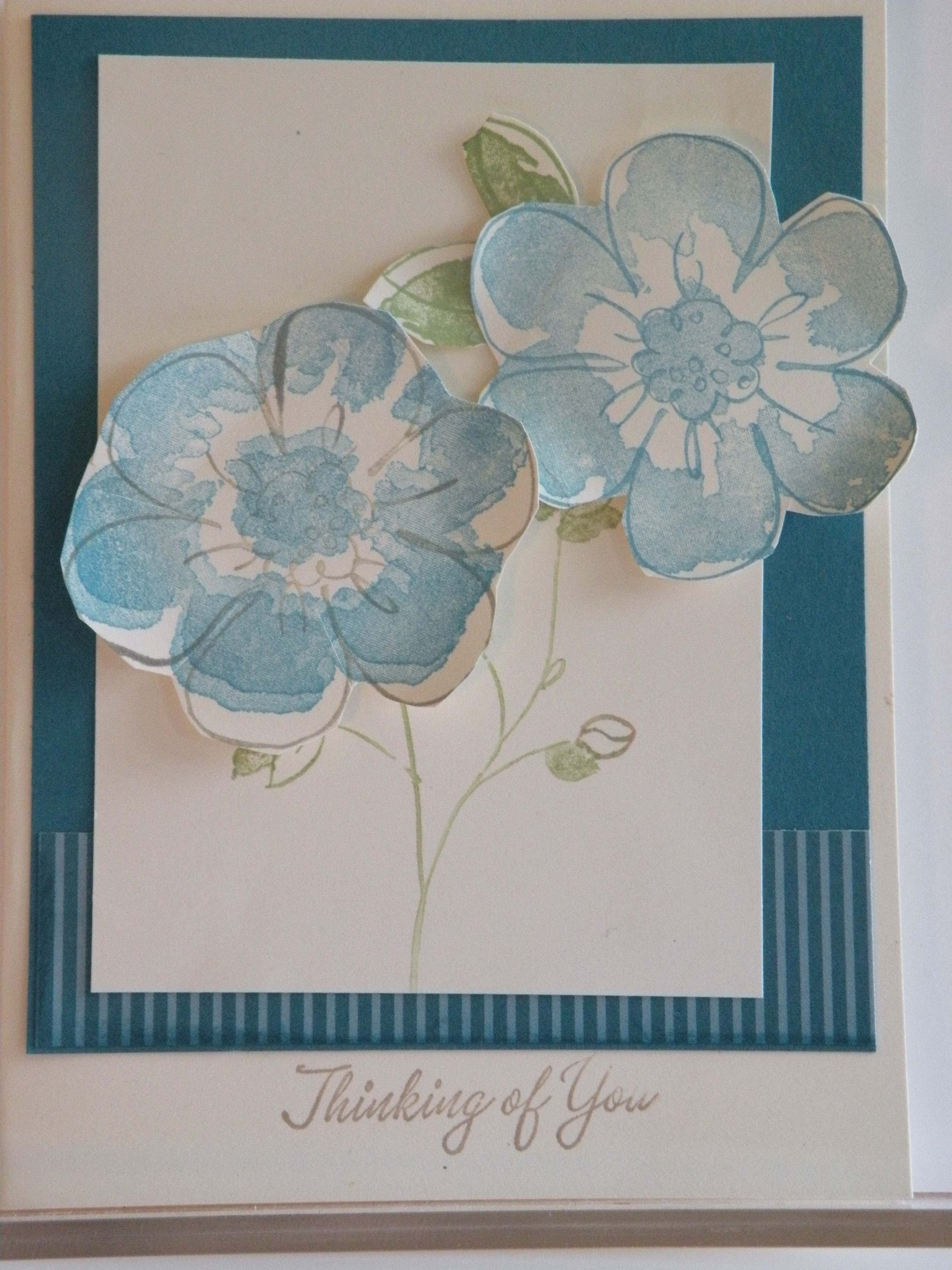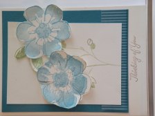 I used Baja Breeze Ink and Pear Pazzazz and stamped onto Very Vanilla Cardstock. I then cut them out, used the stem of the other flower in the set as the base to hold my flowers, which I attached then too. Now can you imagine being told that my card looked like an anorexic stem with breast enlargements on it………………were would you come up with that from…………………told my friend to just go leave me alone and I packed up and went to bed………. might add by this time it was 1pm and yes they should have gone home anyway……………………..right….lol