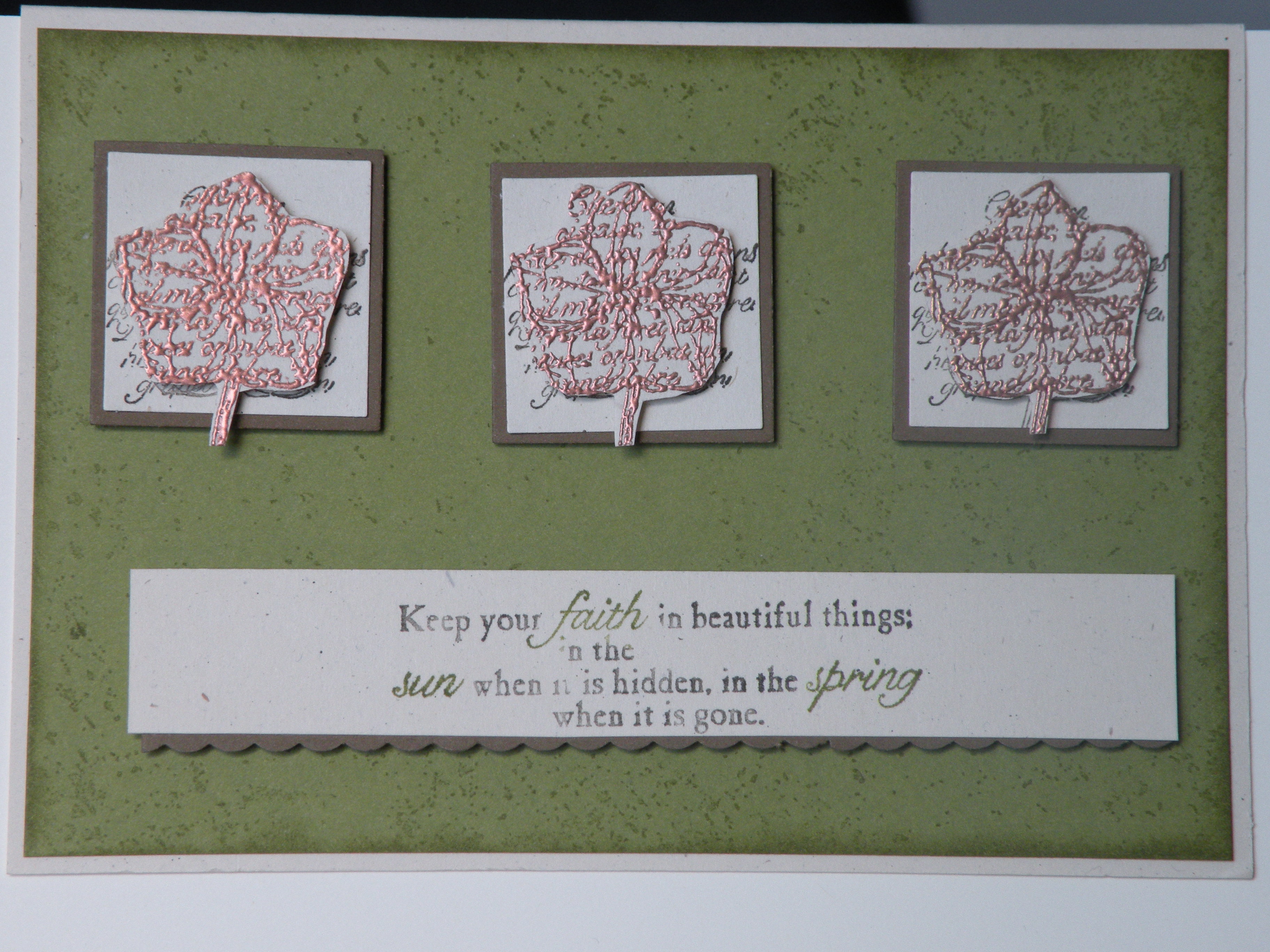 I used the leave out of the “Faith in Nature” set which was a hostess stamp set in the Stampin Up Catalogue for 2011-2012.