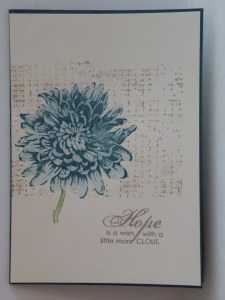 The Blooming with Kindness is such a delightful stamp to use and has some wonderful saying that make up this set. The set is on page 87 of the new Stampin’ Up! Catalogue 2012-2013. Clear mount is # 126442 and the cost is $31.95 and will give you endless uses. On mine card here i used the one that says “Hope is a wish with a little more CLOUT” which I had embossed with the Silver Embossing Powder. I love embossing, but then is that because I am an older stamper?