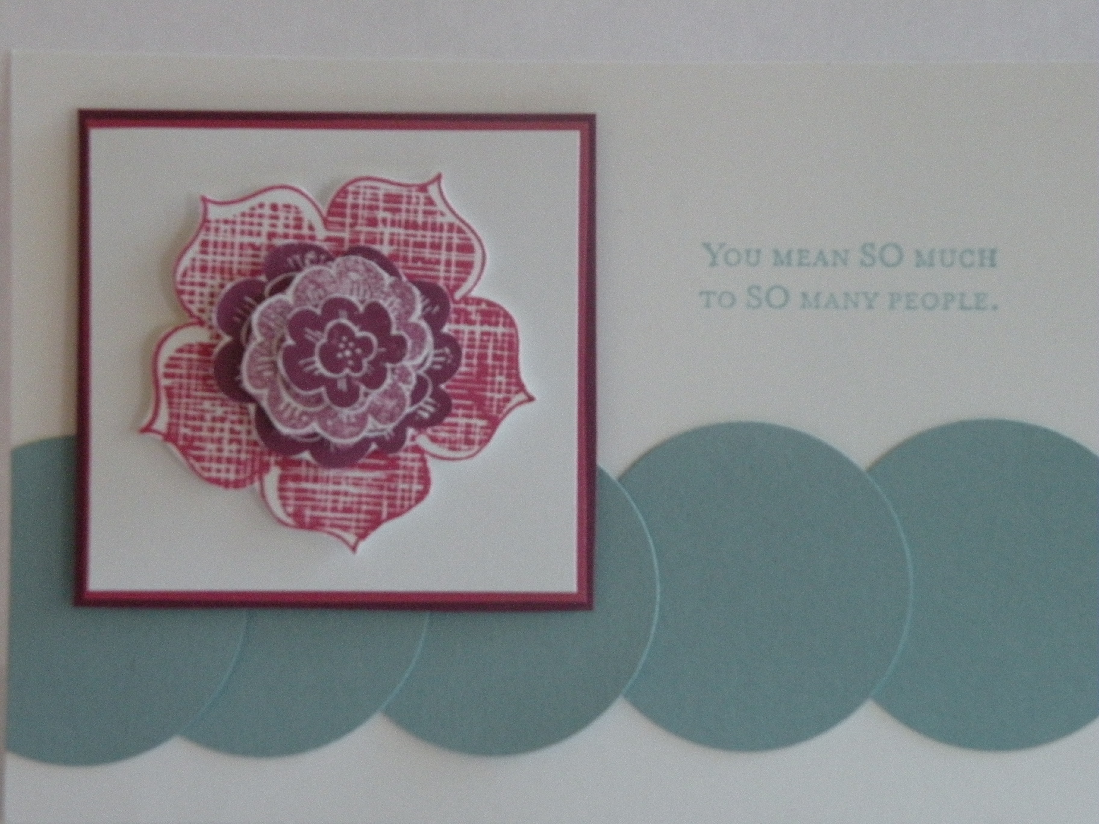 I used the colors of Rich Razzleberry, Very Vanilla and Rose Red Cardstock. I punch out Baja Breeze with my circle punch and layered them on the bottom of the card, adding a sentiment in the Baja Breeze as well.