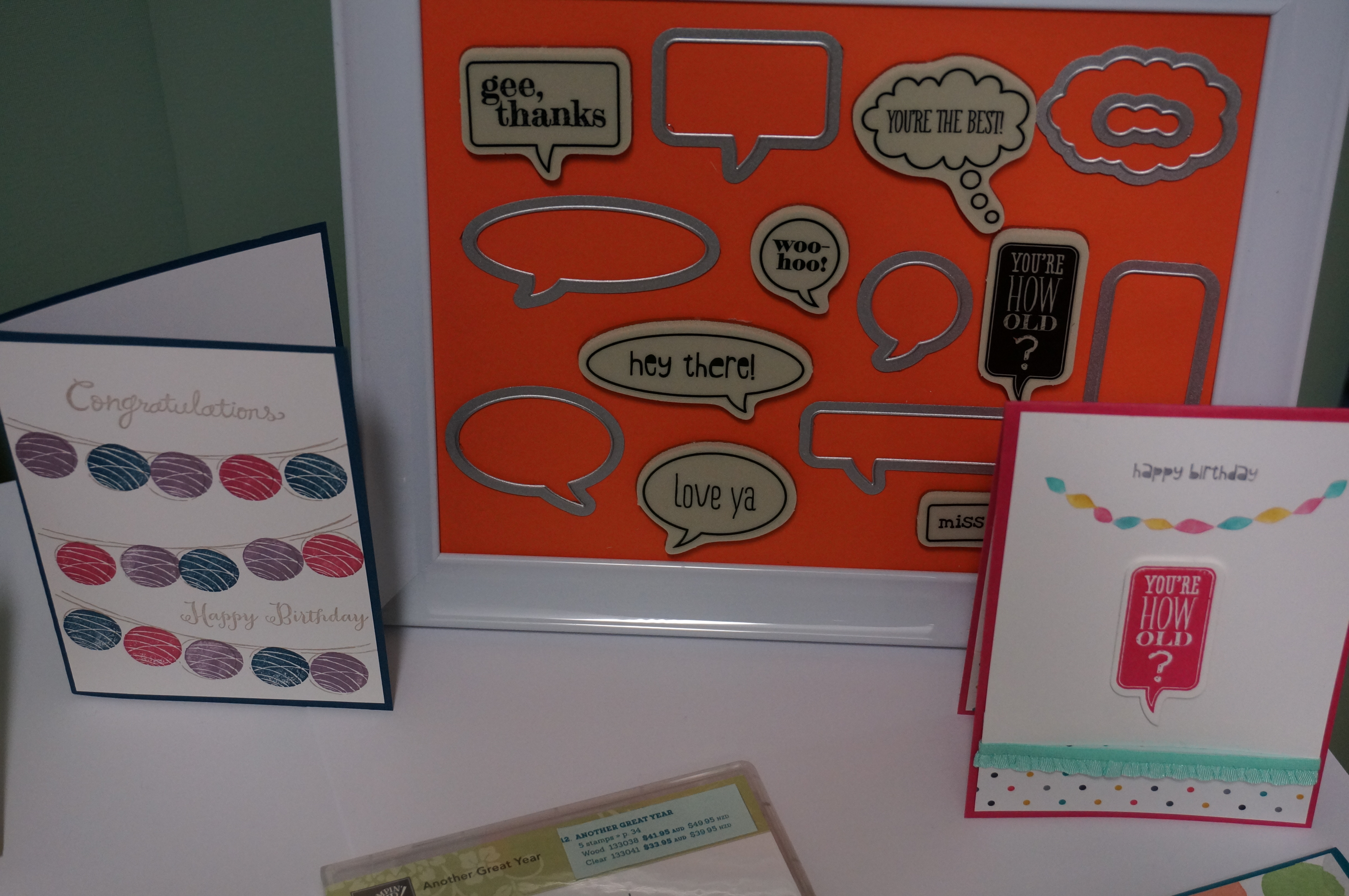 I will endeavour to showcase some of the displays that we had. I love love love this die and stamps “Just Sayin” See it below, comes with both the stamps and the dies.