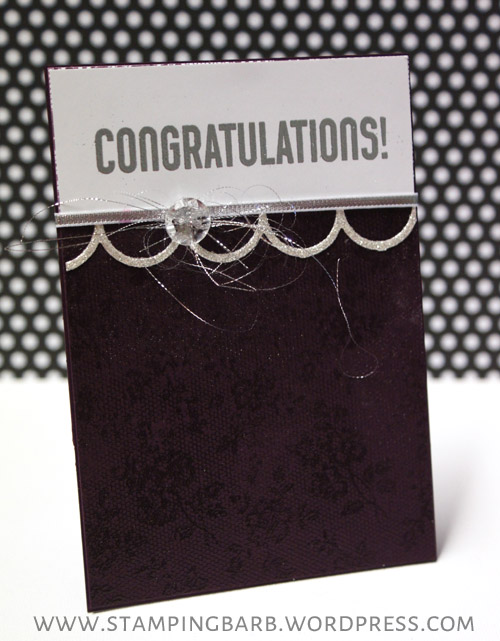 Using Shelli’s stamp set “I love Lace” as a background, I versa marked it then embossed with Clear embossing power on Blackberry Bliss, one of the new in colours. I had originally used the I love lace stamp inked up with Blackberry Bliss and stamped on whisper white cardstock for the top panel and I wanted to use some butterflies on the front. Long story short, I didn’t like it and in the bin they went. I was still able to ring in the Striped Scallop Die to form the scallop on the bottom white along with some beautiful silver ribbon. I then stamped and embossed the word Congratulations in Silber embossing powder above the ribbon and after attaching a beautiful button, they finally shredded some of the ribbon to for the downward hang to represent the idea of something hanging on underneath.