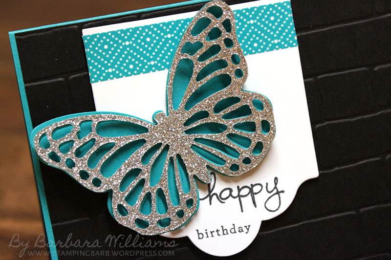 I tripled layered my butterfly, cutting out the body, then two of the cut out ones, one in Bermuda Bay and the other in Silver Glitter.  Nice easy and effective card, anyone who receives this will just love it I am sure.
