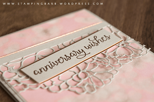 I mounted the Falling in Love Designer Series Paper onto the Sahara Sand Cardstock and then mounted this again on to a Sahara Sand Cardbase. I took the Anniversary wishes out of the set and using the Cooper Embossing powder embossed the greeting onto Sahara Sand, trimmed it then mounted it onto a piece of Copper.