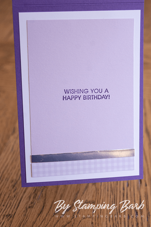 I embossed the Gorgeous Grape cardstock with Silver Embossing powder and attached to silver foil, trimmed to a fine border that attached the designer series papers in color 2019-2020, I used the Purple Posy Gingham Design that was then trimmed and mounted onto the Gorgeous Grape base.