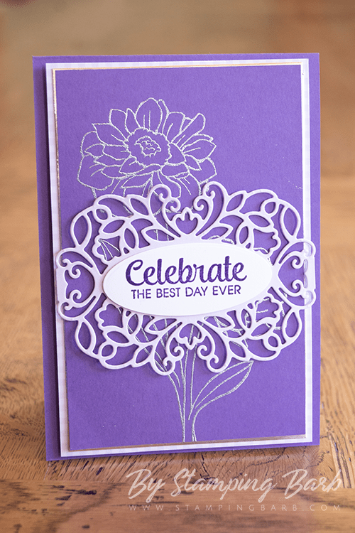 The greeting was heat embossed using clear embossing powder, but wait, its Purple you said? yes I stamped it onto a piece of what cardstock using the Gorgeous Grape ink and my Stamparatus to position it perfectly which then allows me to go back and using VersaMark, stamp and then add my clear embossing powder.