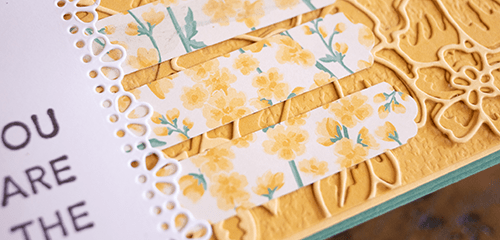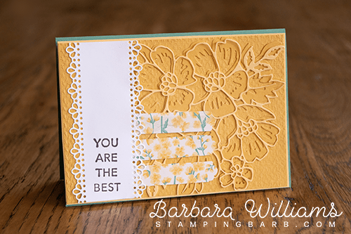 I die cut the blossoms in the new Bumble Bee (BB) Cardstock and then used So Saffron as the highlighted details.