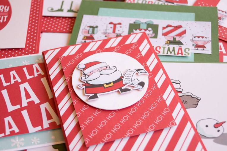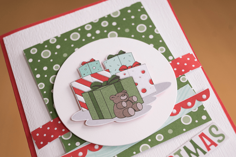 I took one of the Poppy Parade cardbases, a white card front, after cutting out my white circle from this front, I was then able to hide it with a card from the Santa and More pack, that’s the green piece, there were some strips left from other cards, so they become my strips.