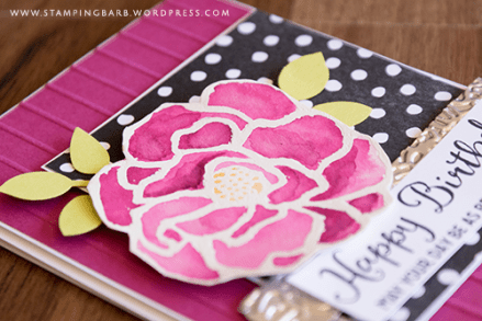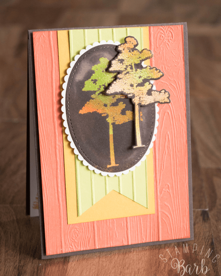 I used to color the branch was the light crumb cake for the branch and touches of light old olive on the leaves with some shading of the crumb cake on the leaf. The little frog was Pineapple Punch with a small touch of Old Olive on this trunk.