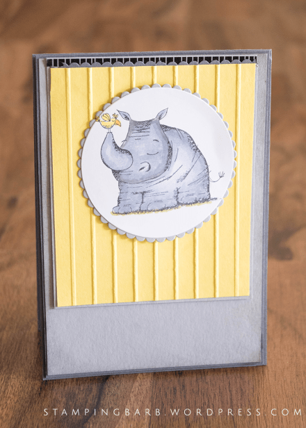 I choose to us Light and Dark Smokey Slate Blends and added extra shading by using the Blends Color Lifter. My little bird was colored with a new color called Dark Pineapple Punch Blends and his beak in a touch of Calypso Coral, under Hippos feet I used light Old Olive Blends to add a touch of grass.