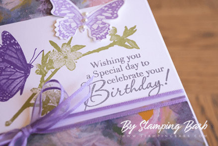 I use the Penned and Painted Stamp Set on shimmer White Cardstock, using white embossing power to stamp down the flowers and leaves, one at a time. Have you found how when using versa mark on white, it’s rather hard to see where you have stamped.